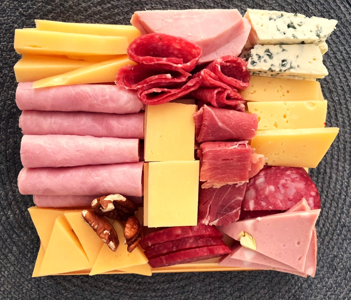 Fiambres: bondiola, salame picado grueso, salame milán, jamón crudo y cocido, mortadela, longaniza, lomito ahumando, leberwurst.